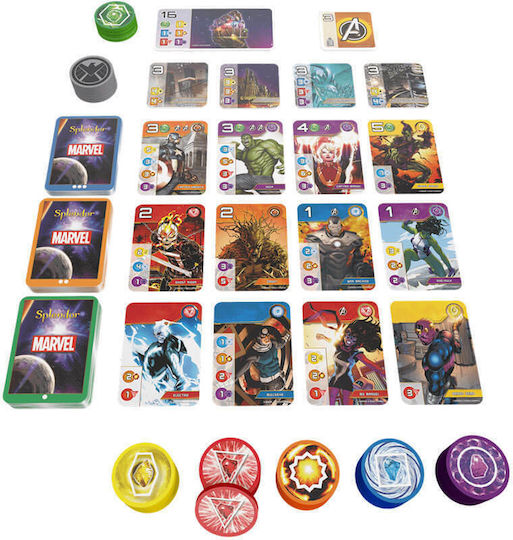 Splendor Marvel is the heroic take on the award-winning original! Avengers, assemble and take on the evil forces and Thanos himself, in a bid to stop him gathering all the infinity stones!