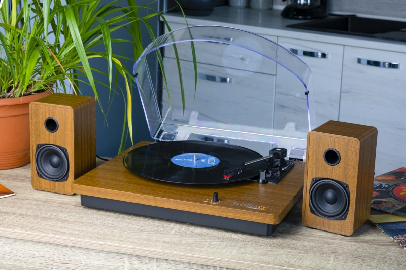 Bluetooth Stereo LP-Player TX-188, 2 external speaker, 45rpm single puck adapter, AUX-cable, USB cable, power adapter, user manual